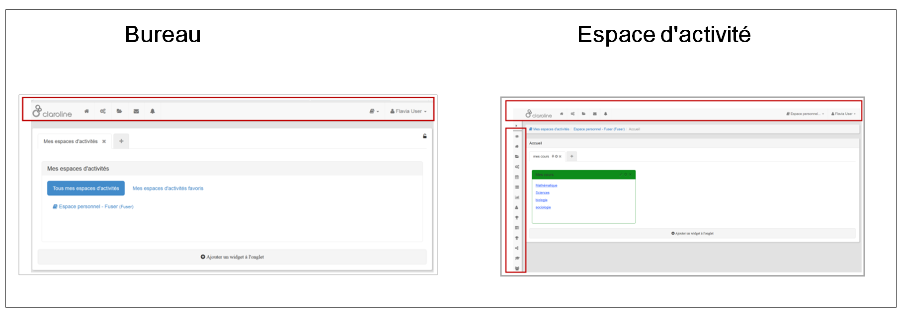 **Figure 7** - La barre d'outils du bureau (bandeau supérieur) et la barre d'outils d'un espace d'activités (menu de gauche et bandeau supérieur)