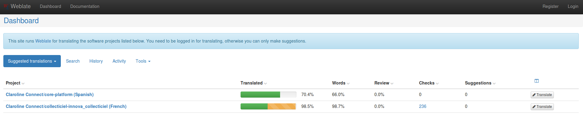 While everybody can browse projects, view translations or suggest them, only registered users are allowed to actually save changes and are credited for every translation made.
